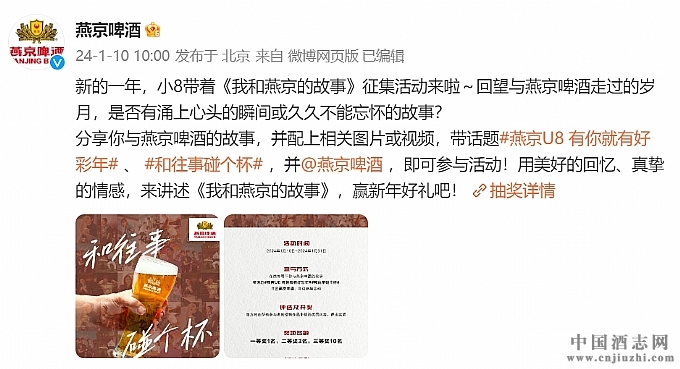 即日起至1月31日,燕京啤酒在其官方微博、微信、抖音上發(fā)起了“和往事碰個(gè)杯!《我和燕京的故事》“有獎(jiǎng)?wù)骷顒?dòng),活動(dòng)一經(jīng)發(fā)布,便有許多忠實(shí)消費(fèi)者參與。