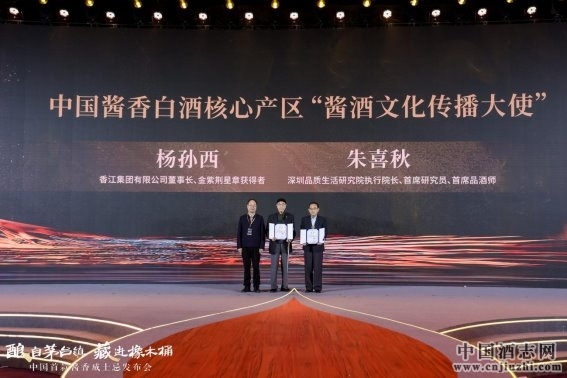 當(dāng)天,在以“釀自茅臺鎮(zhèn) 藏進(jìn)橡木桶”為主題的中國首款醬香威士忌發(fā)布會上,仁懷市委副書記、市長李穎為香港香江集團(tuán)董事長楊孫西,中國商業(yè)發(fā)展中心原主任、深圳品質(zhì)生活研究院執(zhí)行院長、首席研究員、首席品酒師朱喜秋,分別頒發(fā)了“中國醬香白酒核心產(chǎn)區(qū)醬酒文化傳播大使”榮譽(yù)。