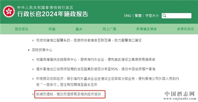 10月16日,香港特區(qū)行政長(zhǎng)官李家超發(fā)布《行政長(zhǎng)官2024年施政報(bào)告》。報(bào)告明確,為促進(jìn)烈酒貿(mào)易,帶動(dòng)物流和儲(chǔ)庫(kù)、旅游和高端餐飲消費(fèi)等高增值產(chǎn)業(yè)發(fā)展,特區(qū)政府參考取消紅酒稅帶動(dòng)紅酒貿(mào)易的成功經(jīng)驗(yàn),即日起,進(jìn)口價(jià)200港元以上的烈酒,200港元(約合人民幣183.15元)以上部分的稅率由100%減至10%;200港元及以下部分,及進(jìn)口價(jià)在200港元或以下的烈酒,稅率則維持不變。
